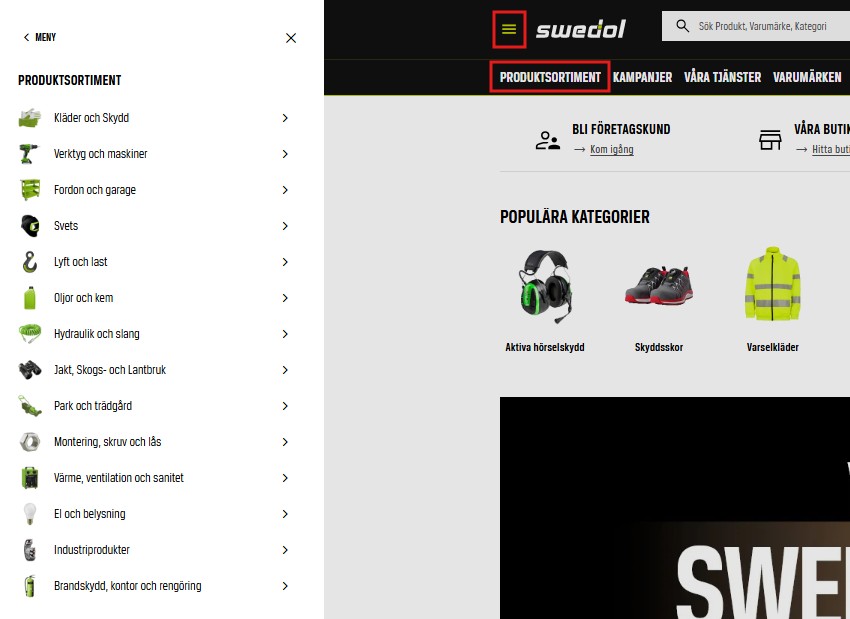 expand_moreDu kan antingen söka i sökrutan högst upp på sidan eller leta dig fram via Produktmenyn.