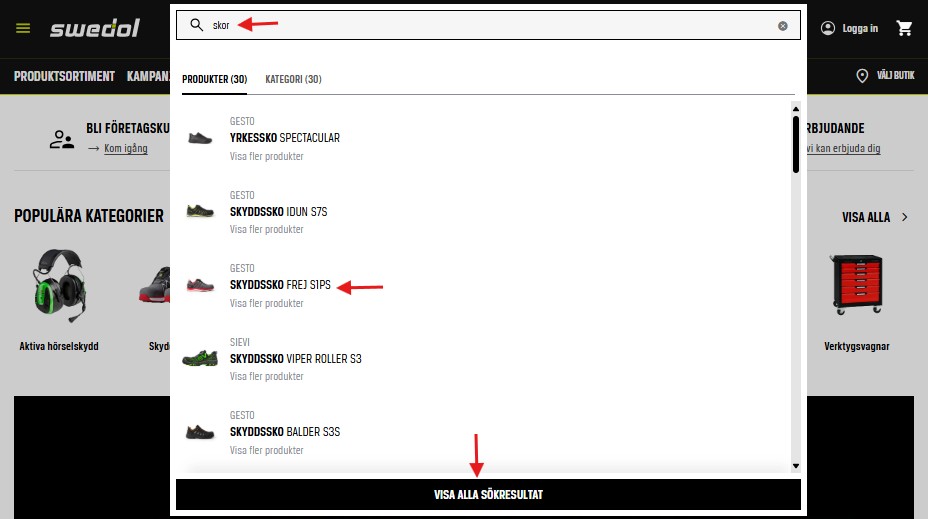 När du börjar skriva i sökrutan kommer du få en eller flera rekommendationer, du kan välja att gå direkt till en produkt eller att se alla sökresultat genom att klicka på "Visa alla sökresultat".