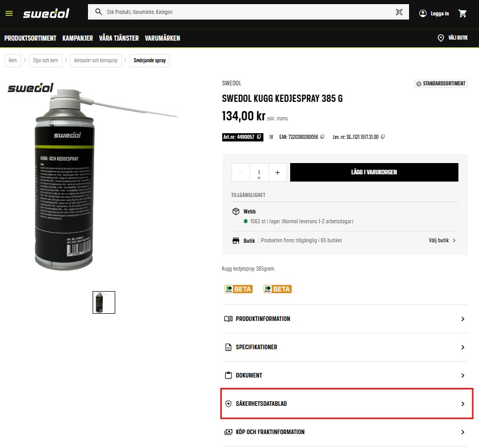 Saknar en produkt sitt säkerhetsdatablad i vår e-handel så kontakta gärna vår kundsupport, vi kan då se till att rätt information kommer upp på produktsidan. Du hittar kontaktinformationen längst ner på startsidan för Frågor och svar.